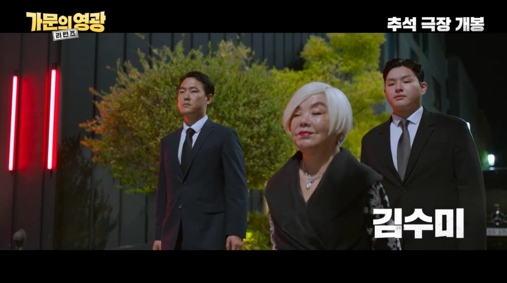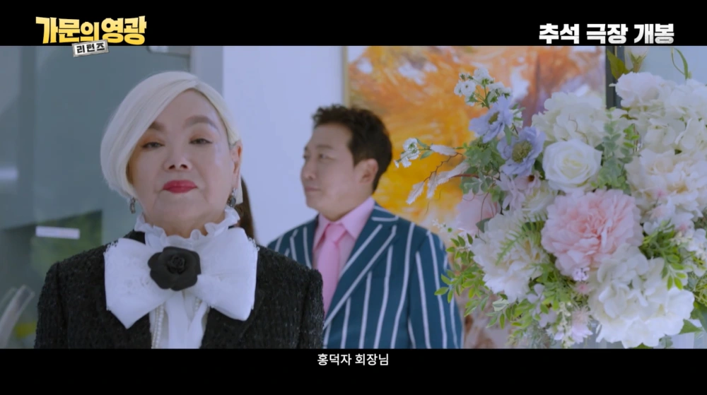김수미는 가문의 영광 영화 시리즈에서 '홍덕자' 역할로 활약했습니다. 이 시리즈는 코미디와 액션을 결합한 영화로, 그녀는 조폭 집안의 개성 강한 어머니로 등장해 특유의 코믹한 연기로 관객들을 사로잡았습니다.