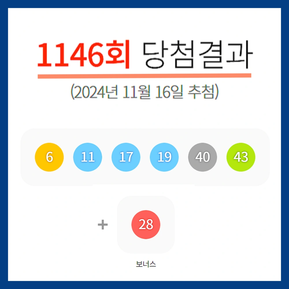1146회 당첨번호는 ‘6, 11, 17, 19, 40, 43’, 그리고 보너스 번호는 '28'입니다. 이번 주 1등 당첨자 중 자동 선택으로 당첨된 사람은 8명이며, 반자동으로 당첨된 사람은 1명, 수동으로 당첨된 사람은 2명으로 확인되었습니다.