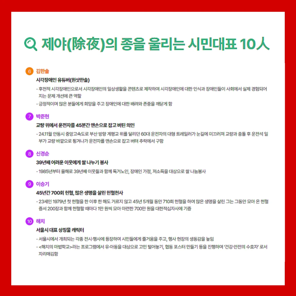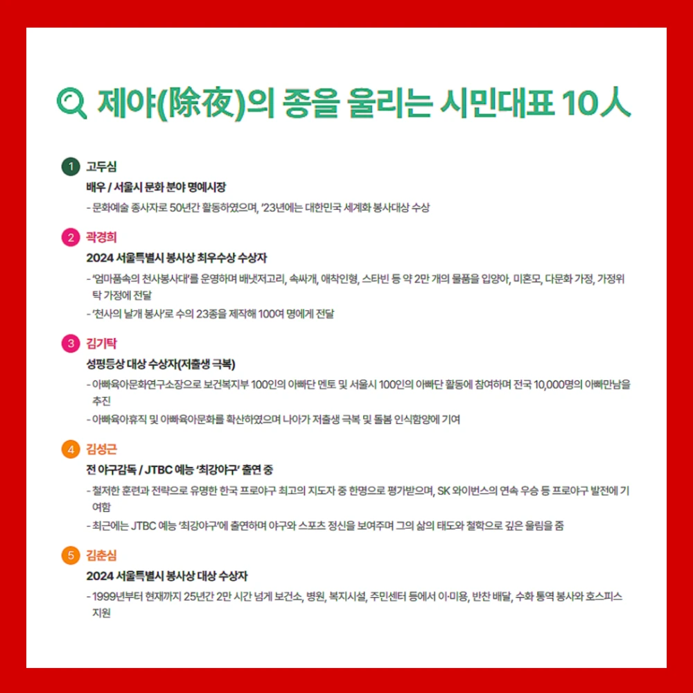 서울시 관계자는 '이번 제야의 종 타종행사는 단순히 한 해를 마무리하는 자리보다는, 사고 희생자들을 기리는 동시에 새해를 맞아 시민 모두가 함께 희망을 다짐하는 시간이 되기를 바란다'라고 전했습니다.